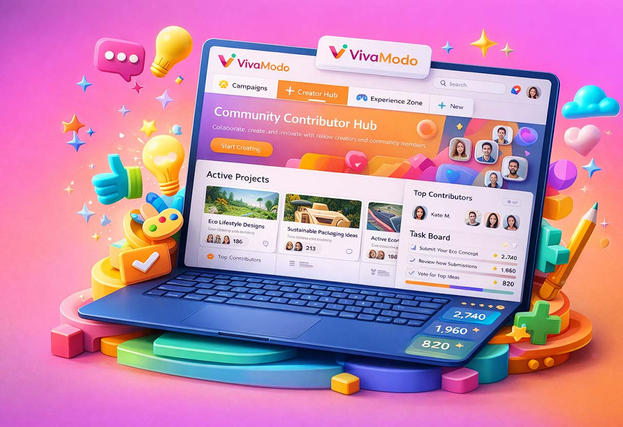 CommunityForge ermöglichte es VivaModo, gemeinsam mit seiner Community in großem Maßstab zu co-kreieren. Wir entwickelten ein strukturiertes Ökosystem, in dem Creators, Kunden und Teams über geführte Workflows, KI-gestützte Kreativität und gamifizierte Beteiligung zusammenarbeiteten.
