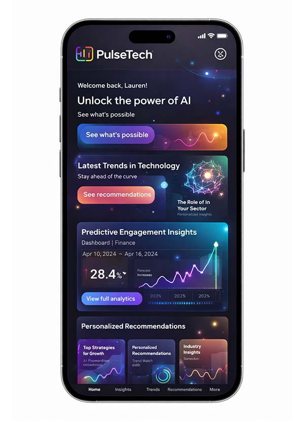 Zusätzlich entwickelten wir prädiktive Erlebnis-Modelle, die Nutzerbedürfnisse antizipieren und sie durch intelligente, intuitive Journeys führen. Um die Marke menschlicher wirken zu lassen, gestalteten wir dialogorientierte Marken-Flows, die interagieren, unterstützen und sich wie ein digitaler Assistent anpassen. Alle Erlebnisse sind in einen kontinuierlichen Lernkreislauf eingebunden, der es der Marke ermöglicht, selbstständig zu testen, zu lernen und sich zu optimieren – und PulseBrand zu einem wirklich intelligenten, sich entwickelnden Markensystem macht.