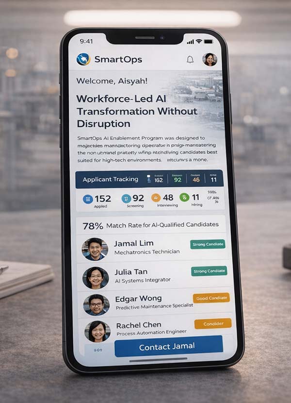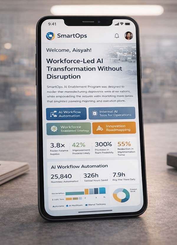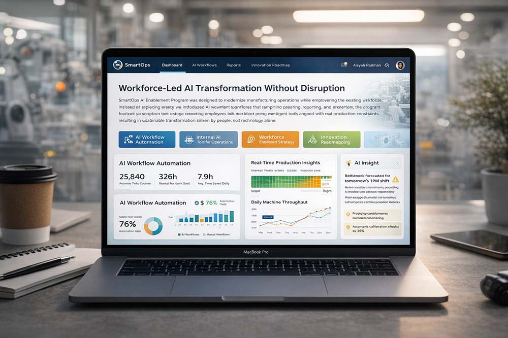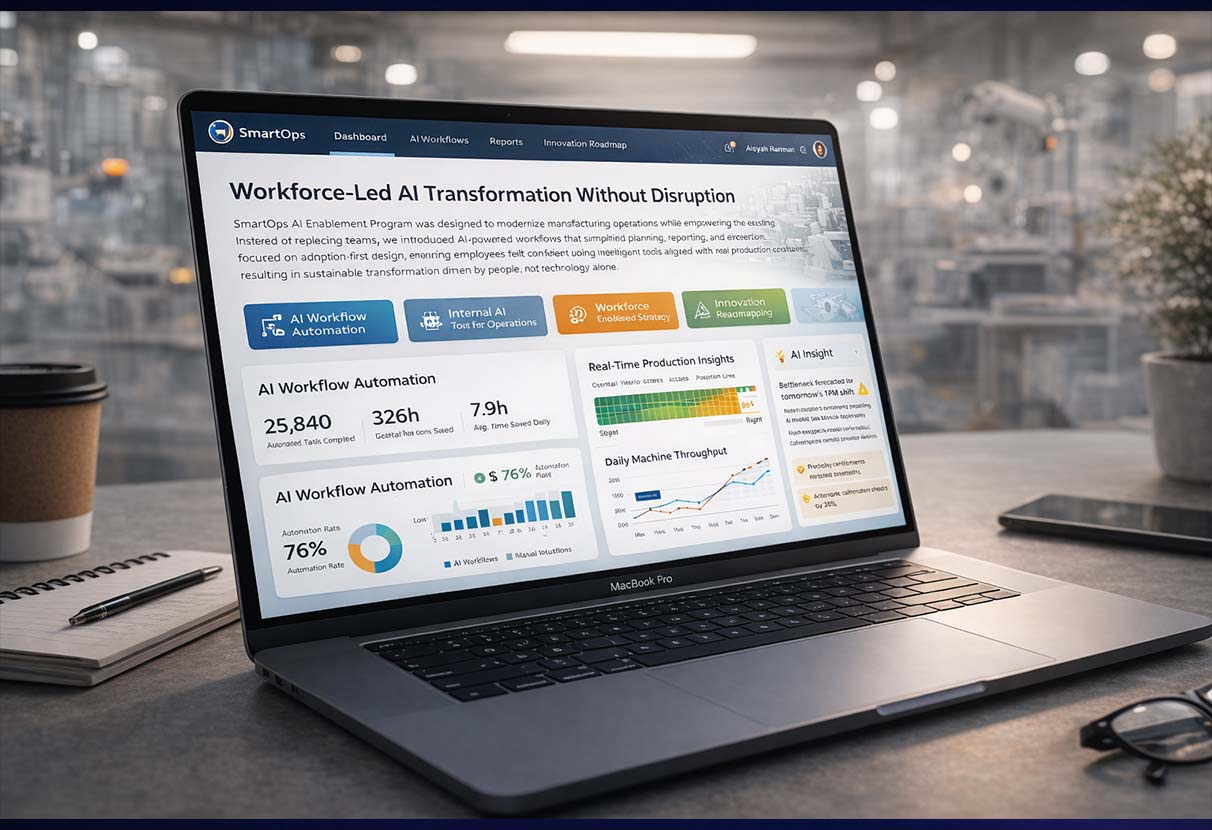 Das SmartOps KI-Enablement-Programm wurde entwickelt, um Fertigungsprozesse zu modernisieren und gleichzeitig die bestehende Belegschaft zu stärken. Anstatt Teams zu ersetzen, führten wir KI-gestützte Workflows ein, die Planung, Reporting und Ausführung vereinfachten.